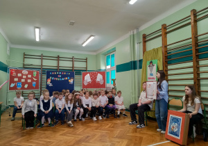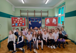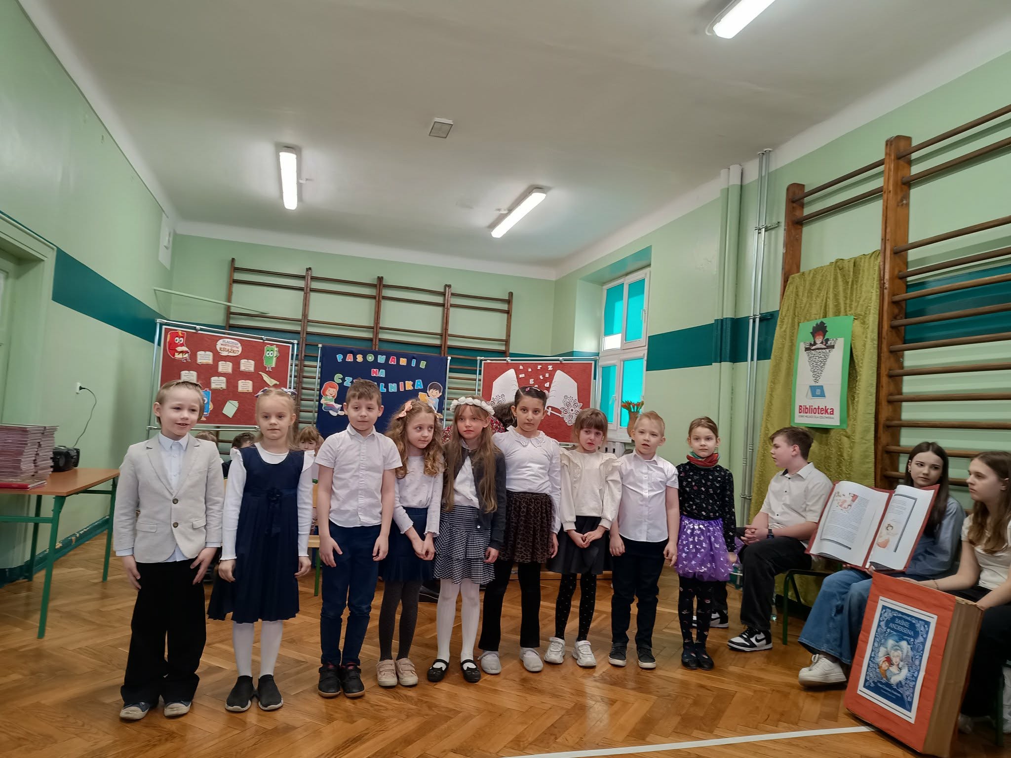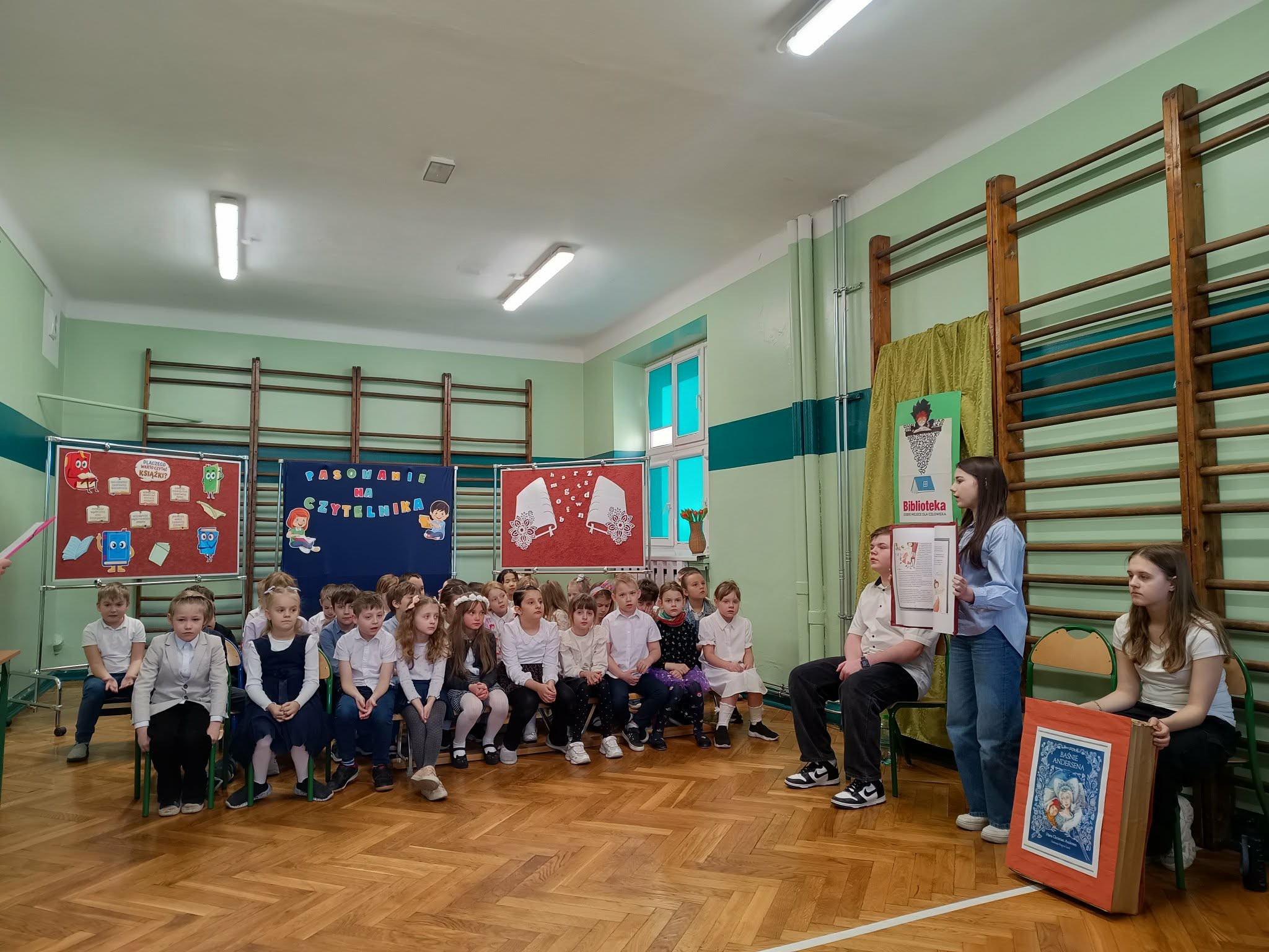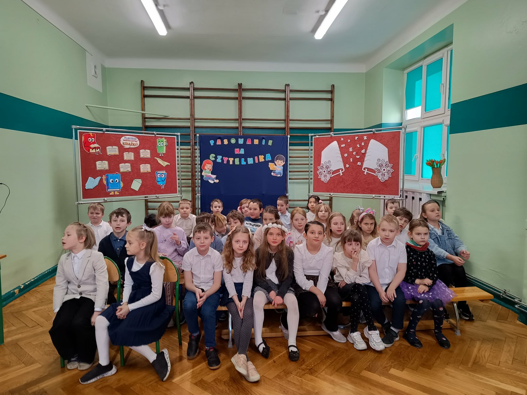 Klasa 1A i 1B miały pasowanie na czytelnika. Pani bibliotekarka przygotowała z dziećmi montaż słowno -muzyczny. W uroczystości brali udział uczniowie klas ósmych. Pasowanie na czytelnika przeprowadziła pani dyrektor i pani z biblioteki. Wszystko oglądali rodzice i pani wicedyrektor.