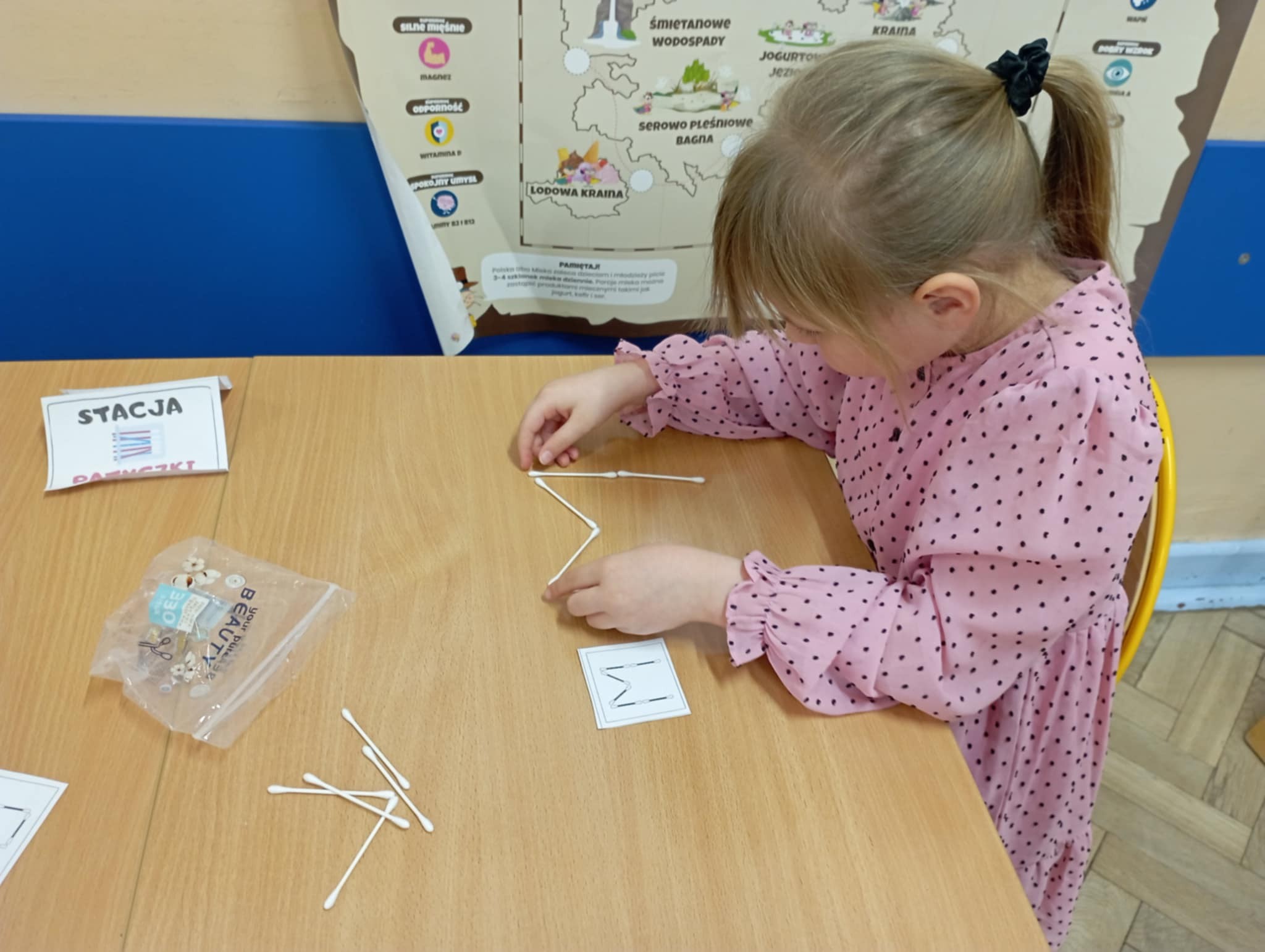Klasa 1a zrealizowała kolejne zadanie w ramach innowacji pedagogicznej „Literki w akcji” – majowe wyzwanie: alfabetyczne stacje zadaniowe. Podczas zajęć dzieci pracowały w grupach, wykonując różnorodne zadania przy specjalnie przygotowanych stacjach. Uczniowie m.in. układali puzzle, dopasowywali ilustracje do liter oraz szukali drogi w labiryncie ukrytym w kształcie litery. Zabawa metodą stacji zadaniowych pozwalała wykorzystać różne techniki i aktywności, które wspierały opanowanie alfabetu. Uczniowie nie tylko utrwalali poznane litery, ale także rozwijali koordynację wzrokowo-ruchową, zwinność manualną, koncentrację oraz umiejętność pracy pod presją czasu.