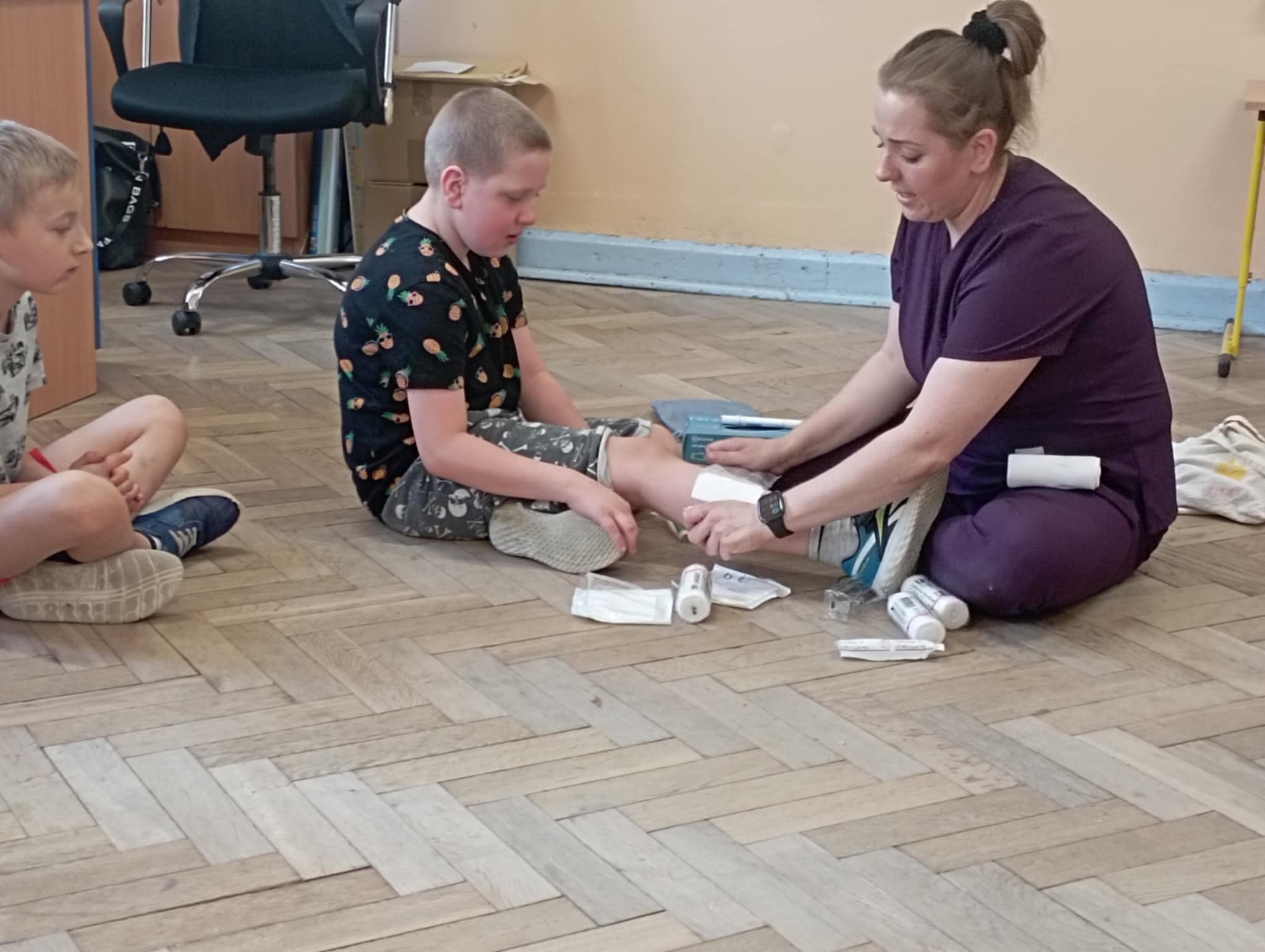 We wtorek, 17 czerwca, w klasie 1a odbyły się zajęcia z pierwszej pomocy przedmedycznej. Warsztaty poprowadziła pani Kasia – mama Janka, naszego kolegi z klasy – która pracuje jako opiekun medyczny w szpitalu. Pani Kasia opowiedziała dzieciom o swojej pracy - trudnym, ale jakże pięknym zawodzie medycznym, wymagającym powołania, ale przede wszystkim predyspozycji. Pokazała proste zabiegi, takie jak zakładanie opatrunku, prawidłowe przyklejenie plastra czy mierzenie ciśnienia. Wielką atrakcją była możliwość posłuchania bicia własnego serca przez stetoskop. Uczniowie poznali również procedury działania w sytuacjach zagrożenia życia oraz utrwalili numery alarmowe. Dzieci nie tylko z zaangażowaniem słuchały, ale też aktywnie uczestniczyły w ćwiczeniach – samodzielnie wykonywały podstawowe czynności ratownicze oraz uczyły się, jak prawidłowo ułożyć poszkodowanego w pozycji bocznej ustalonej. Tego typu zajęcia są niezwykle ważne – uczą odpowiedzialności, odwagi i właściwego reagowania, kiedy ktoś potrzebuje pomocy. To połączenie zabawy z nauką, które może przynieść bezcenny efekt – ratowanie życia. Serdecznie dziękujemy pani Kasi za poświęcony czas i cenną lekcję!