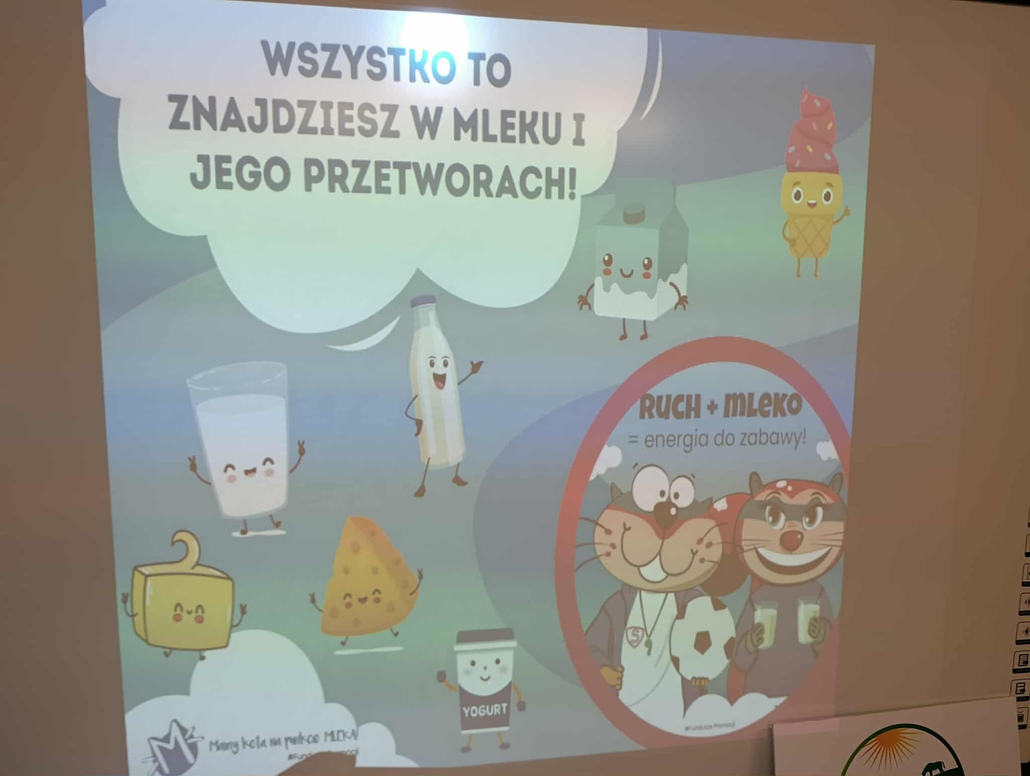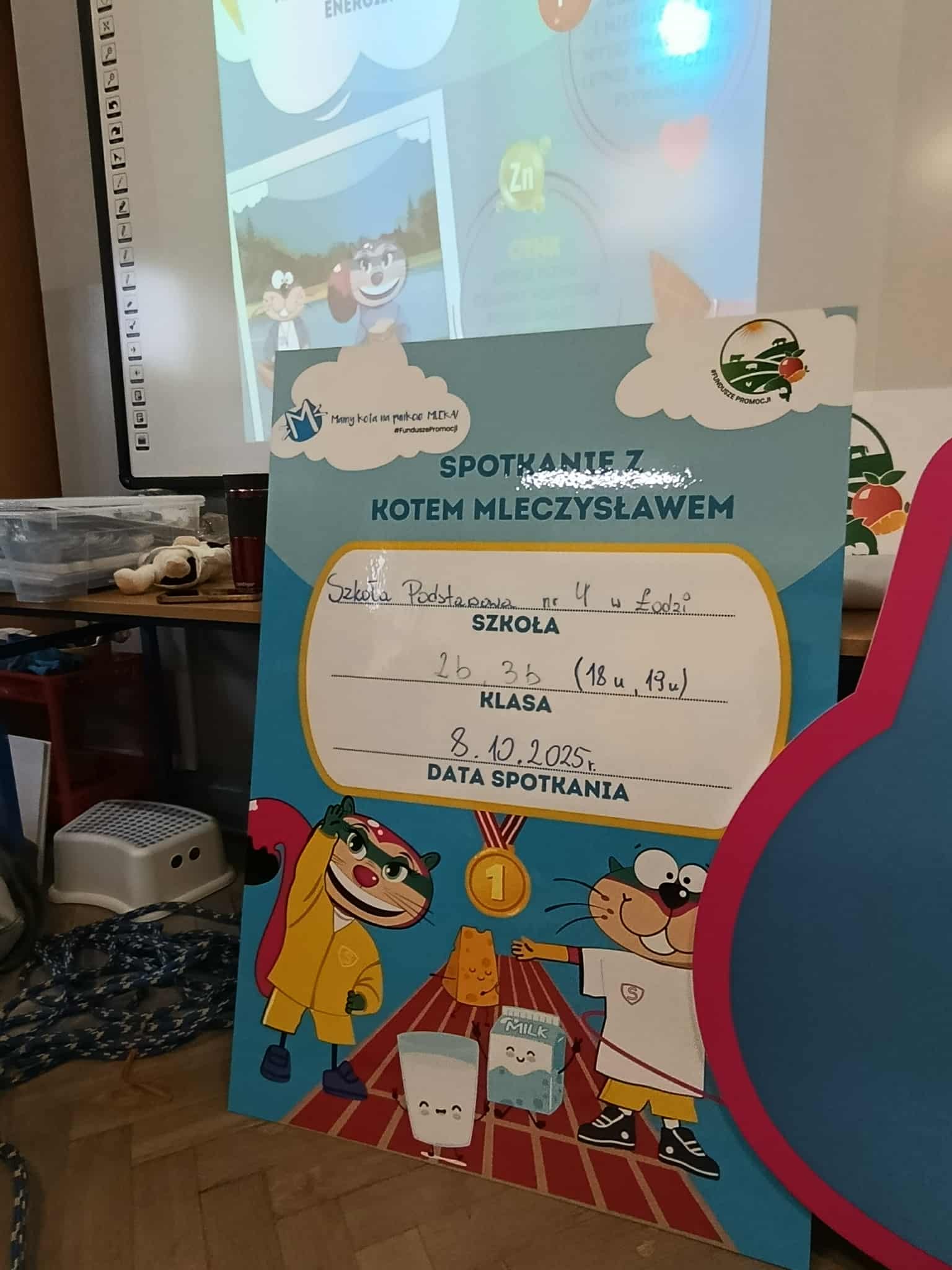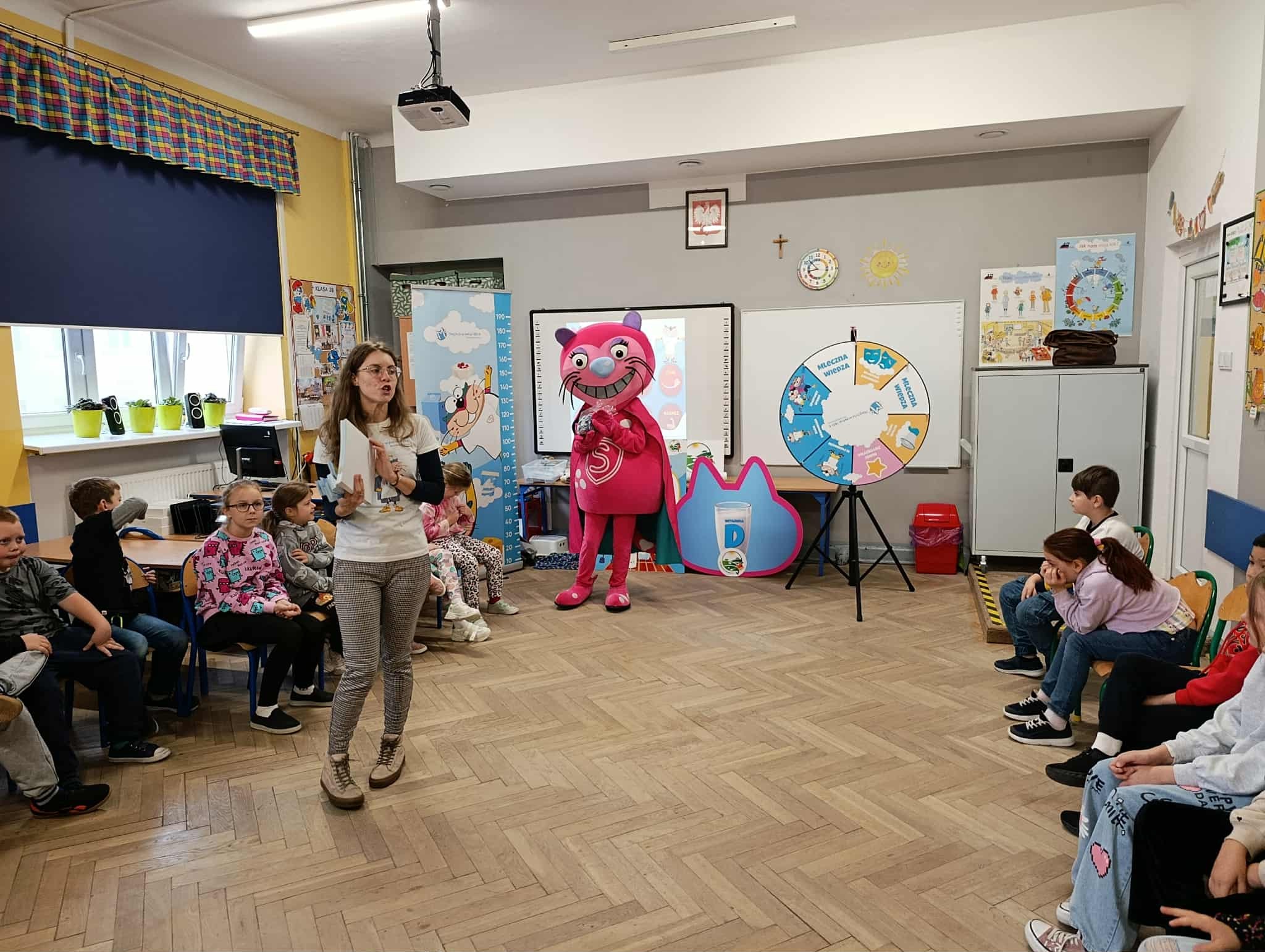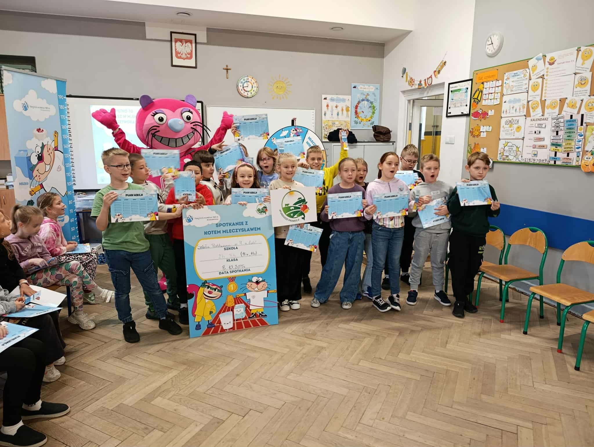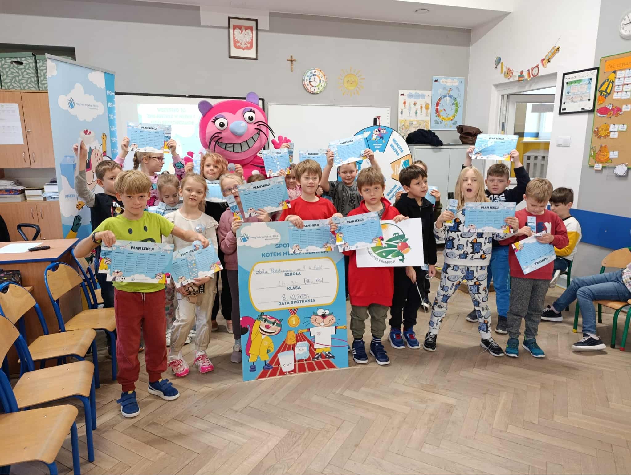 Uczniowie klasy 2b i 3b wzięli udział w warsztatach w ramach projektu "Mamy Kota na punkcie mleka". Uczniów odwiedziła Mleczna Kita i wspólnie utrwalali wiadomości o wartościach odżywczych mleka i produktów mlecznych. Dzieci wzięły udział w zabawach ruchowych i quizach. Na koniec każdy dostał pamiątkową plakietkę, plan lekcji, dyplom i zakładkę do książki. Wszyscy byli bardzo zadowoleni:)