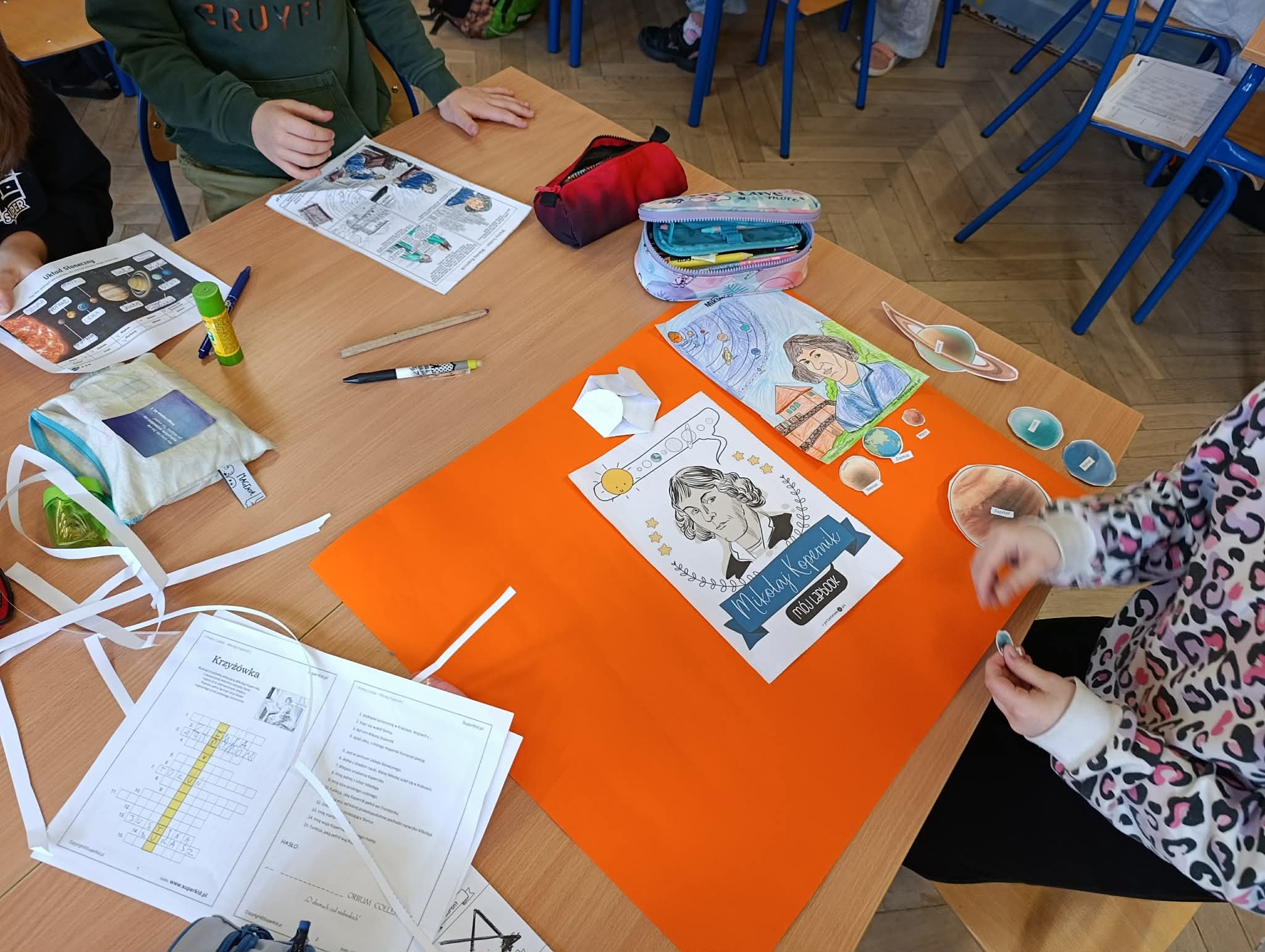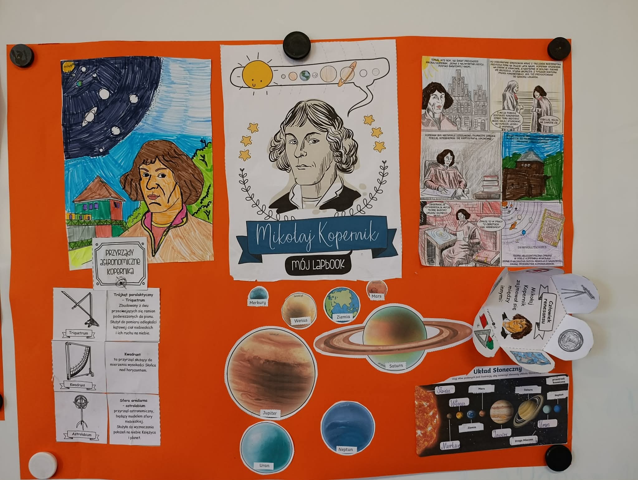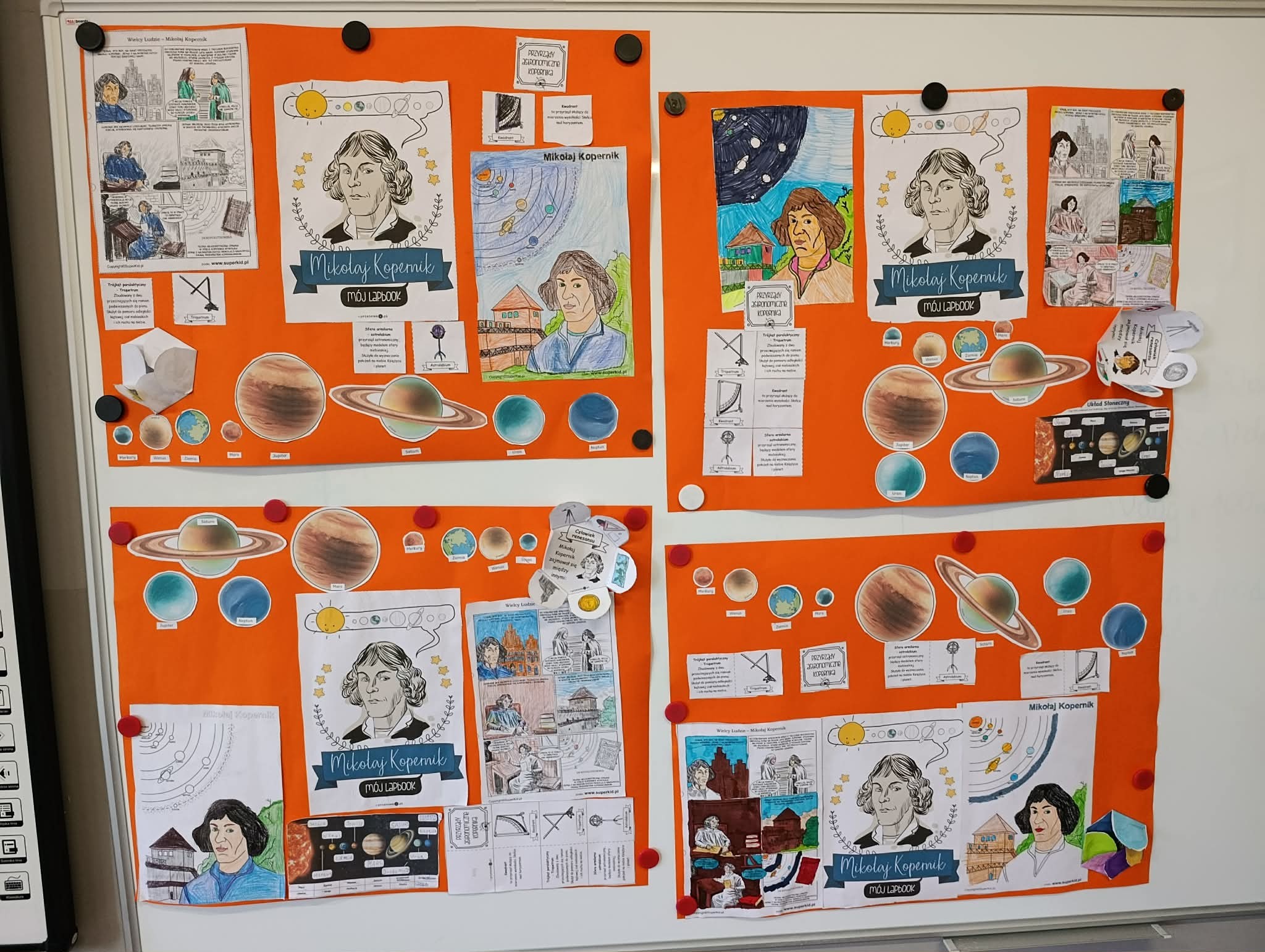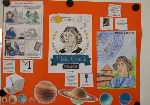 Klasa 2B zrealizowała kwietniowe zadanie w projekcie "Odkrywamy Polskę z Polinką". Dzieci wykonały w grupach plakat o Mikołaju Kopernika. Dzieci poznawały postać M. Kopernika przy okazji tematów związanych ze Słońcem i kosmosem. Były zdumione, że M. Kopernik w tak odległych czasach, bez komputera i internetu dokonał tak ważnego odkrycia. Zapamiętały dużo wiadomości o jego życiu. Nauczyły się na pamięć rymowanki: "Wstrzymał Słońce, ruszył Ziemię, polskie go wydało plemię".