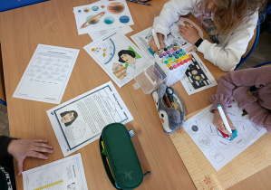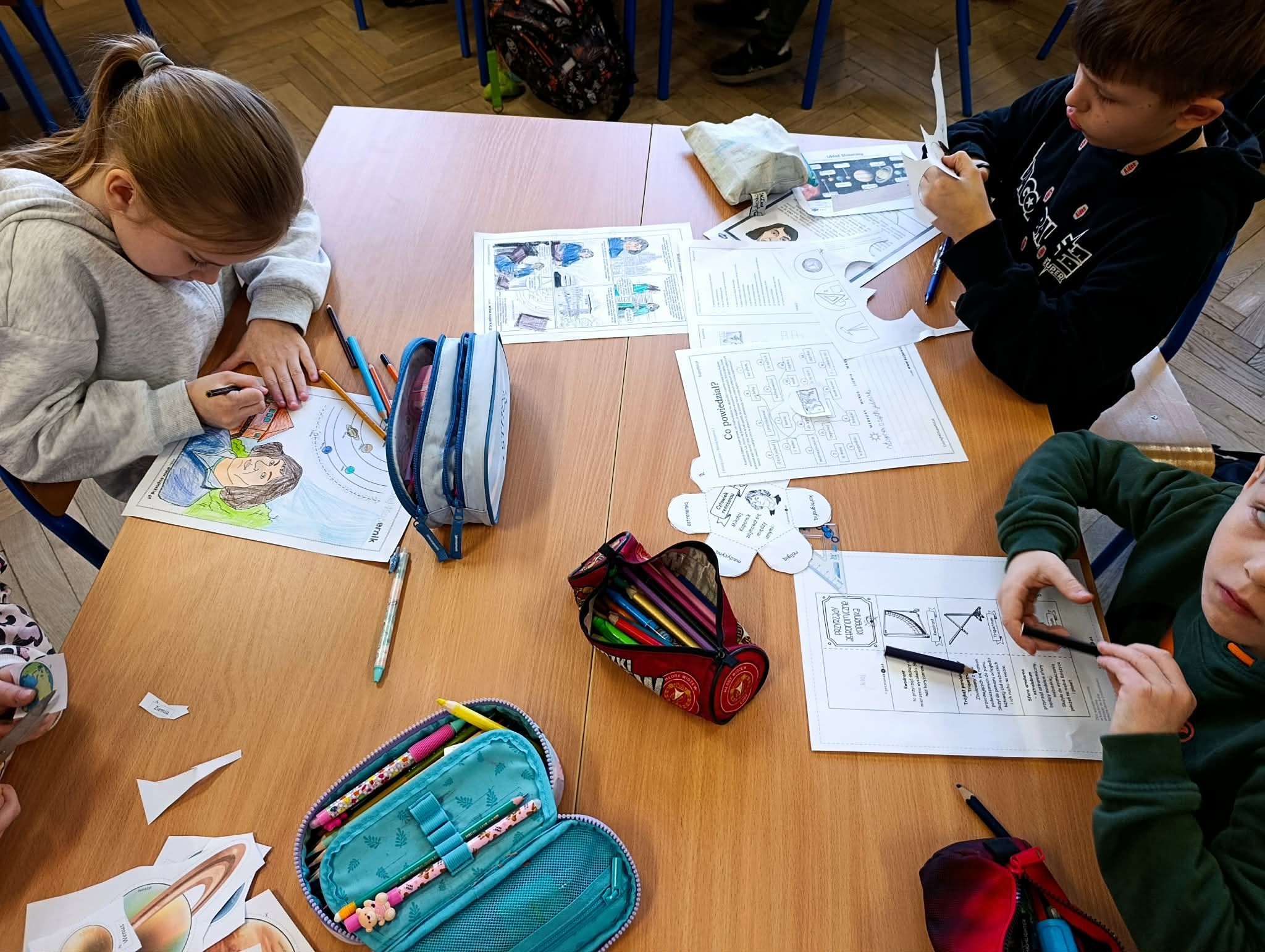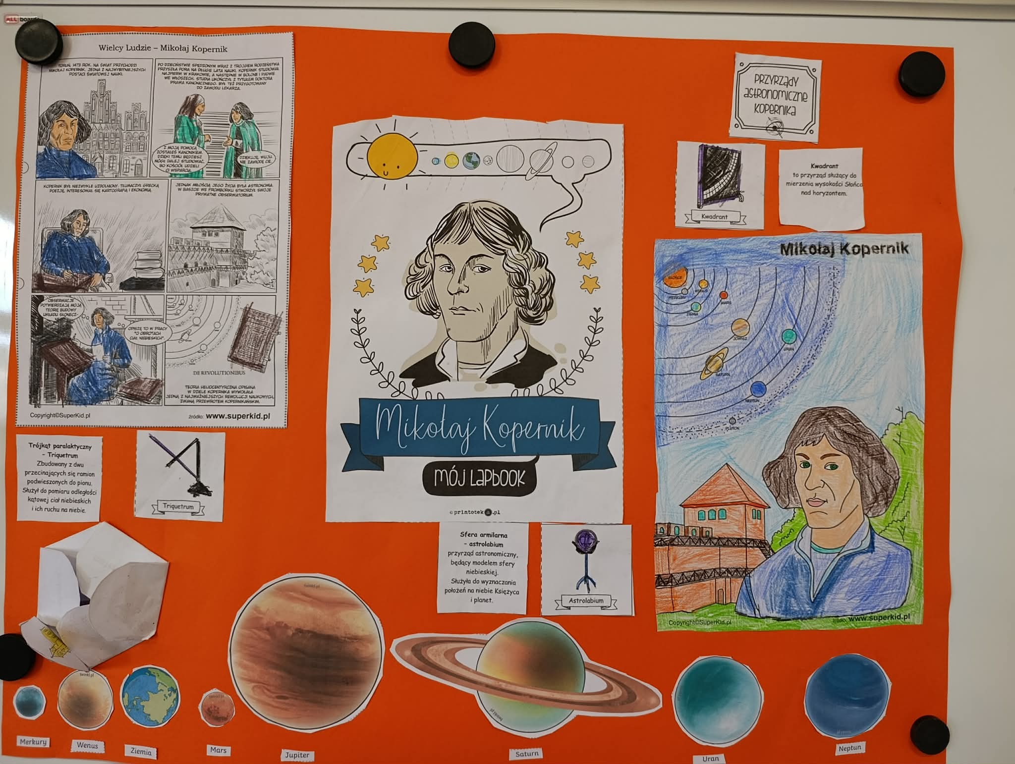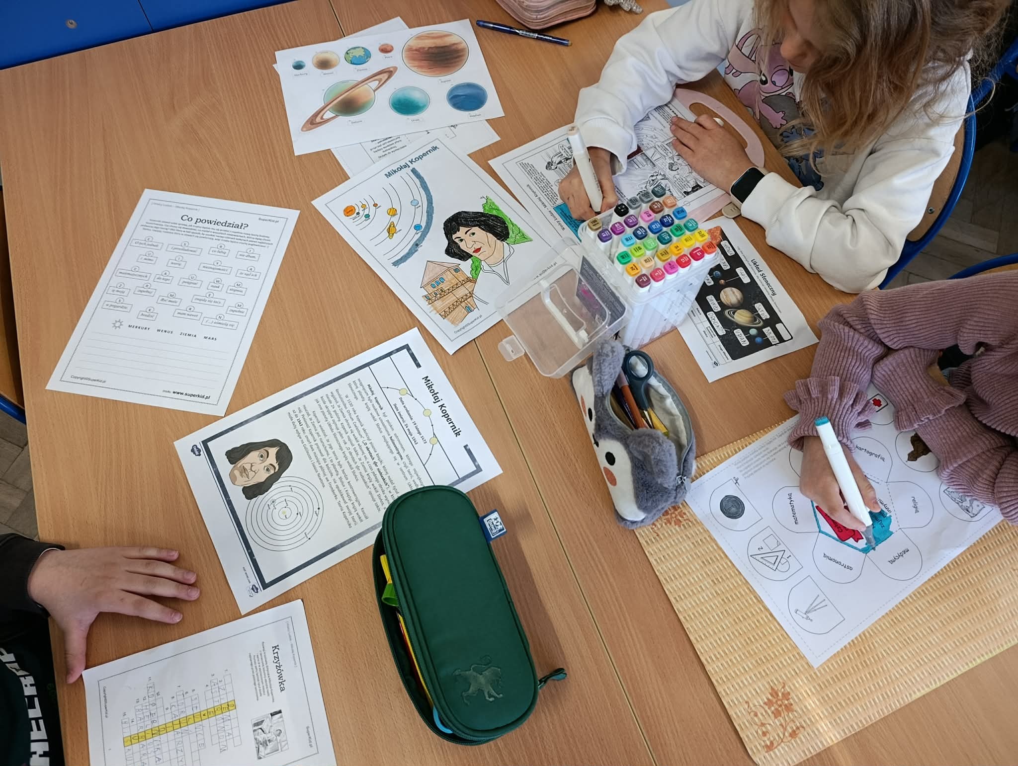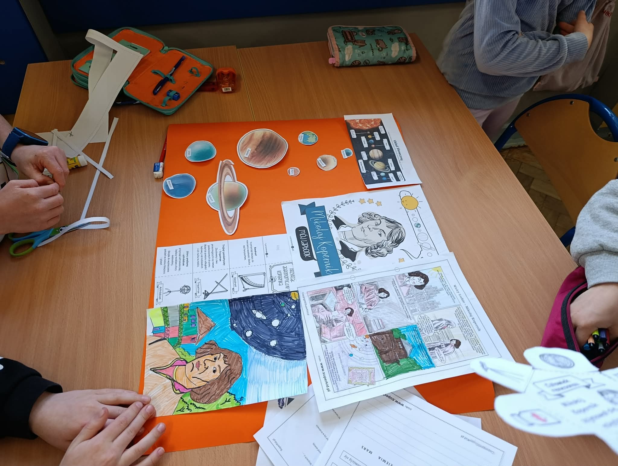 Klasa 2B zrealizowała kwietniowe zadanie w projekcie "Odkrywamy Polskę z Polinką". Dzieci wykonały w grupach plakat o Mikołaju Kopernika. Dzieci poznawały postać M. Kopernika przy okazji tematów związanych ze Słońcem i kosmosem. Były zdumione, że M. Kopernik w tak odległych czasach, bez komputera i internetu dokonał tak ważnego odkrycia. Zapamiętały dużo wiadomości o jego życiu. Nauczyły się na pamięć rymowanki: "Wstrzymał Słońce, ruszył Ziemię, polskie go wydało plemię".