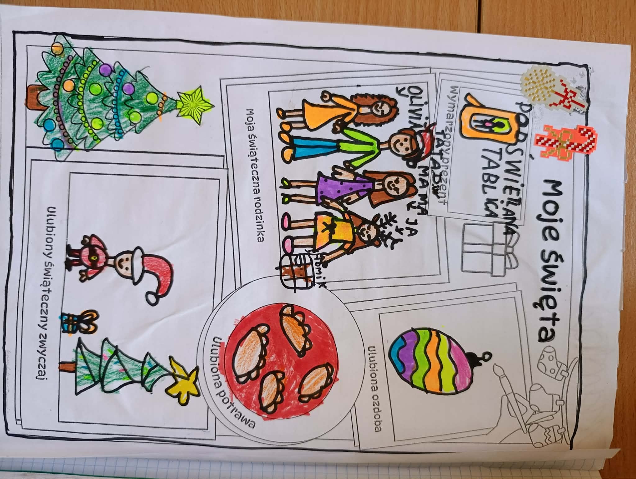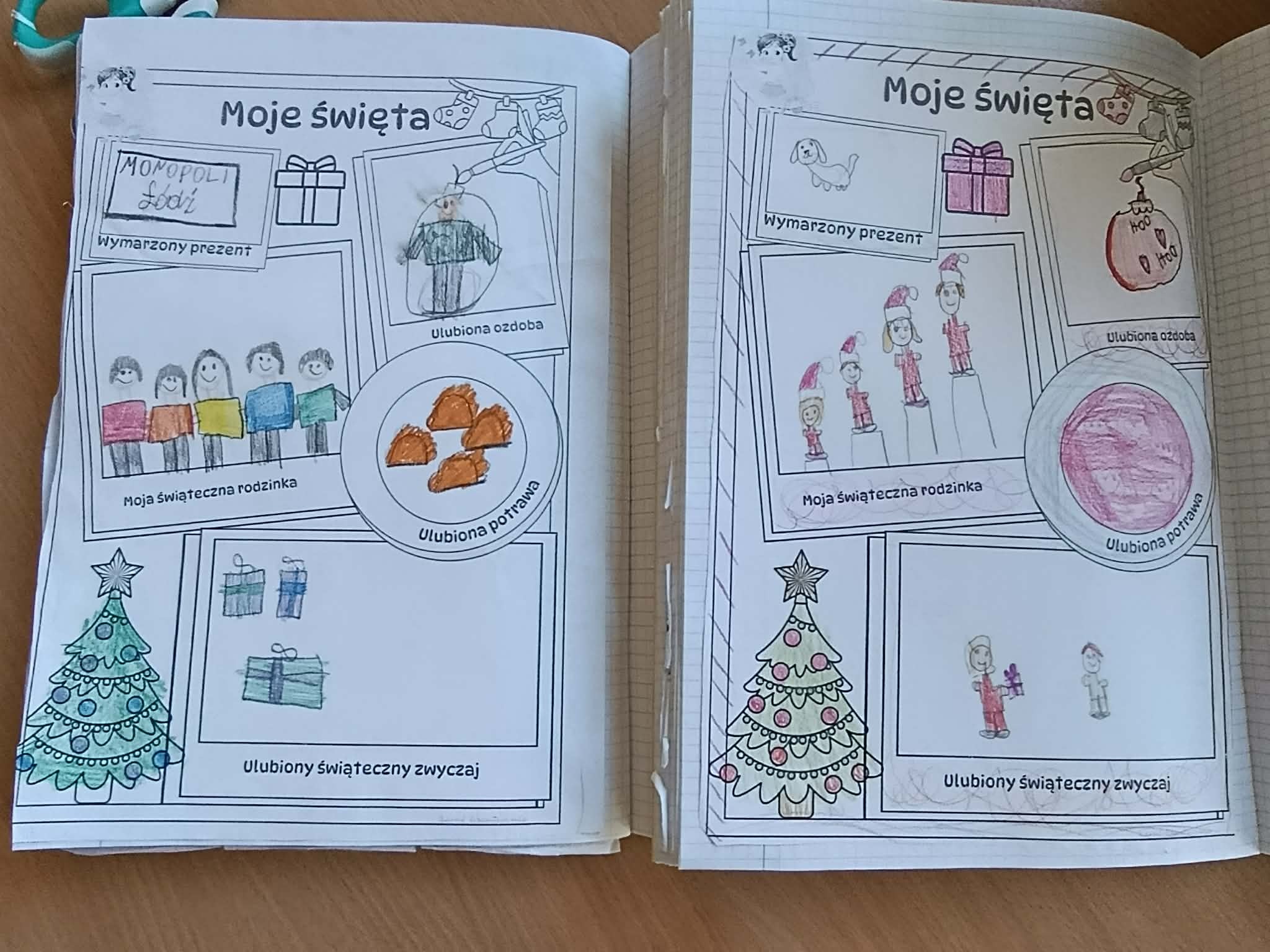 Klasa 2B zakończyła realizację grudniowych zadań w projekcie "Poznajemy Polskę z Polinką". Dzieci przeczytały grudniową bajkę, wykonały kartki świąteczne, pokolorowały świąteczną Polinkę i z kolorowanek utworzyły choinkę. Dzieci utrwalały także zwyczaje świąteczne rysując potrawy i wybrane zwyczaje.