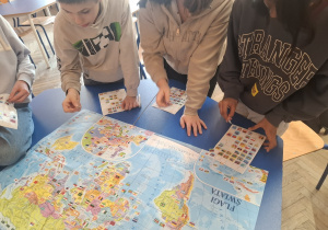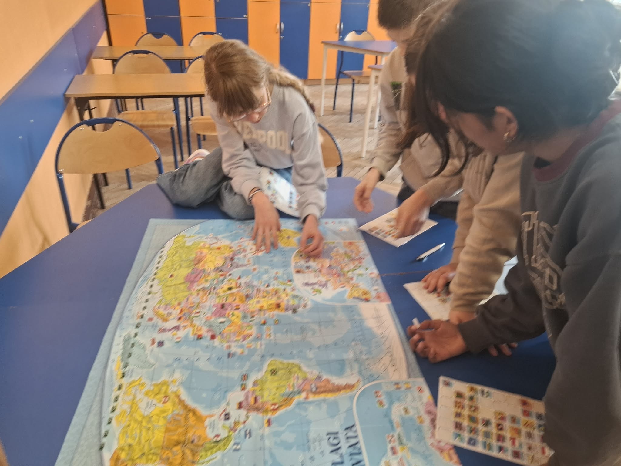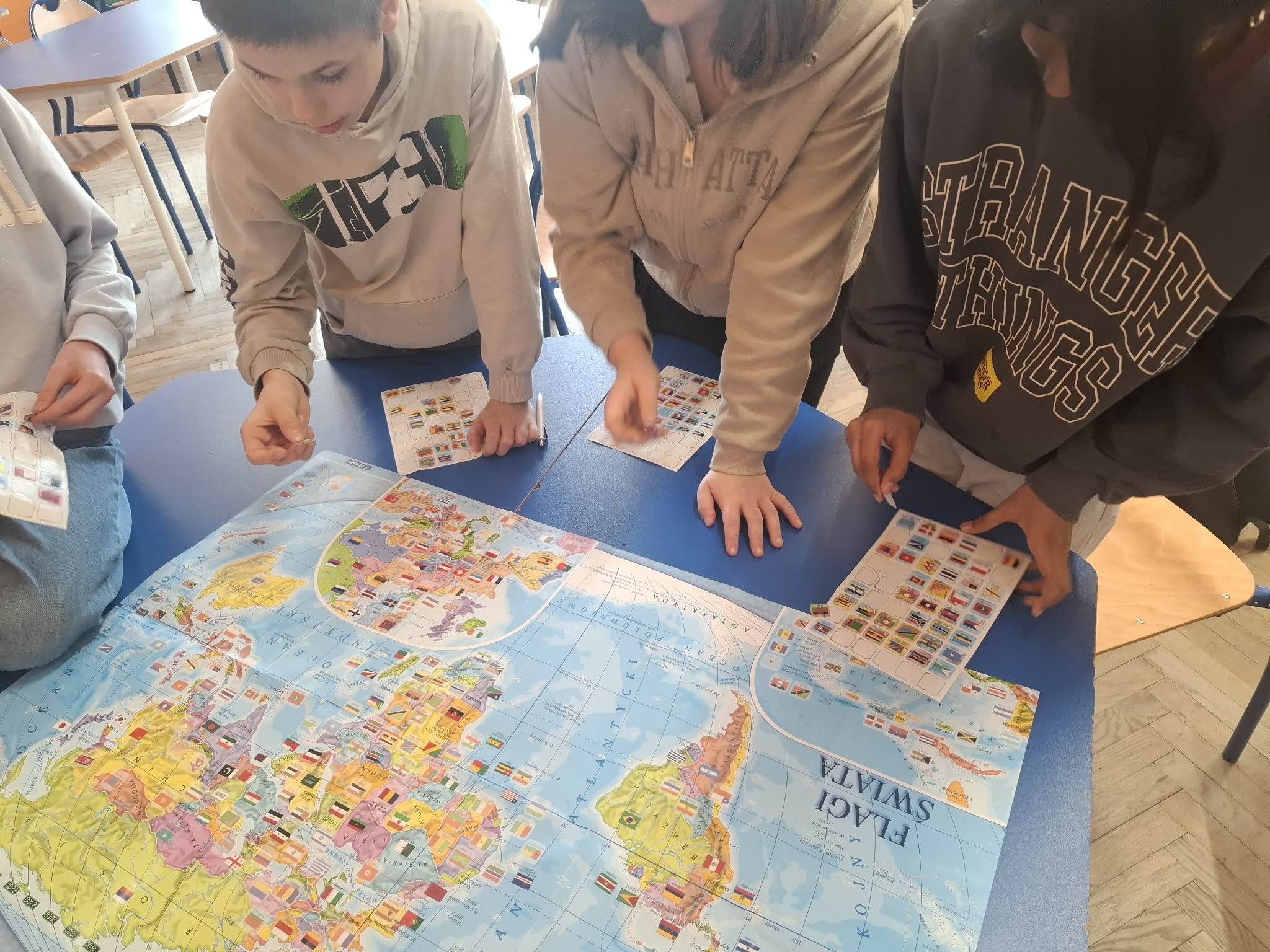 Ostatnie zajęcia koła geograficznego wyjątkowo spodobały się uczniom. Pracowaliśmy z mapą świata, poznając położenie geograficzne wybranych państw oraz ich flagi. Uczniowie z zaangażowaniem wyszukiwali kraje i oznaczali je na mapie kolorowymi naklejkami, dzięki czemu nauka stała się ciekawa i bardzo interaktywna.